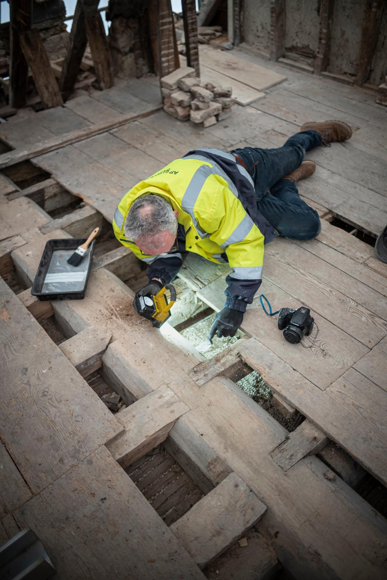 Archaeologist Matt Champion looks under the floorboards at Oxburgh Hall.