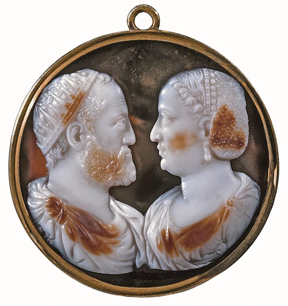 Domenico Compagni (called Domenico de’ Cammei), Cameo of Cosimo de’ Medici and Eleonora di Toledo, ca. 1574. Agate and gold. Diameter 1 1/2 in. (3.7 cm). Museo degli Argenti, Palazzo Pitti, Florence.