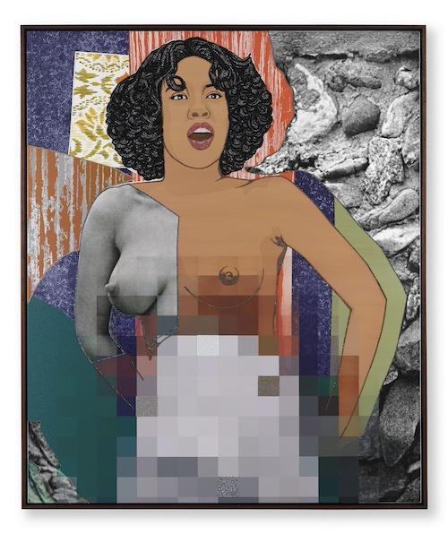 From 2013 onward, collage became a prominent component of her work. Her Jet Series, using “Jet” magazine’s nude calendar, directly addresses issues of Black beauty. By altering images with paint, pixelation, and rhinestones, she comments on cosmetic enhancement while deconstructing the male gaze.
