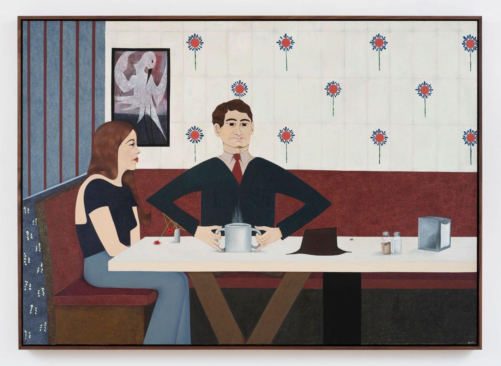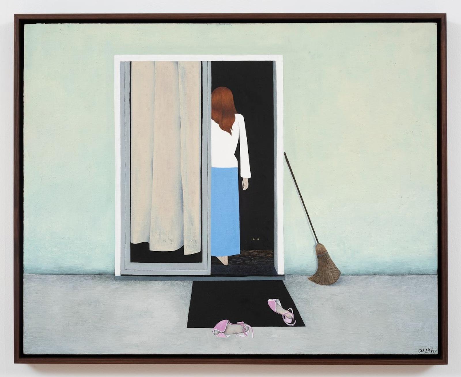 Even the more straightforward pieces vibrate with an underlying whimsy: a woman stands in a doorway with her back towards the viewer, as a cat's yellow eyes peer out from the dark house; a couple sits together with the man holding a double-handled mug of coffee, as his bent arms cause the decorative flowers to jut out in angular directions; a woman sweeps black and white spheres as they roll around a dizzying room, with a single orb placed in the corner of the window, resembling the moon.