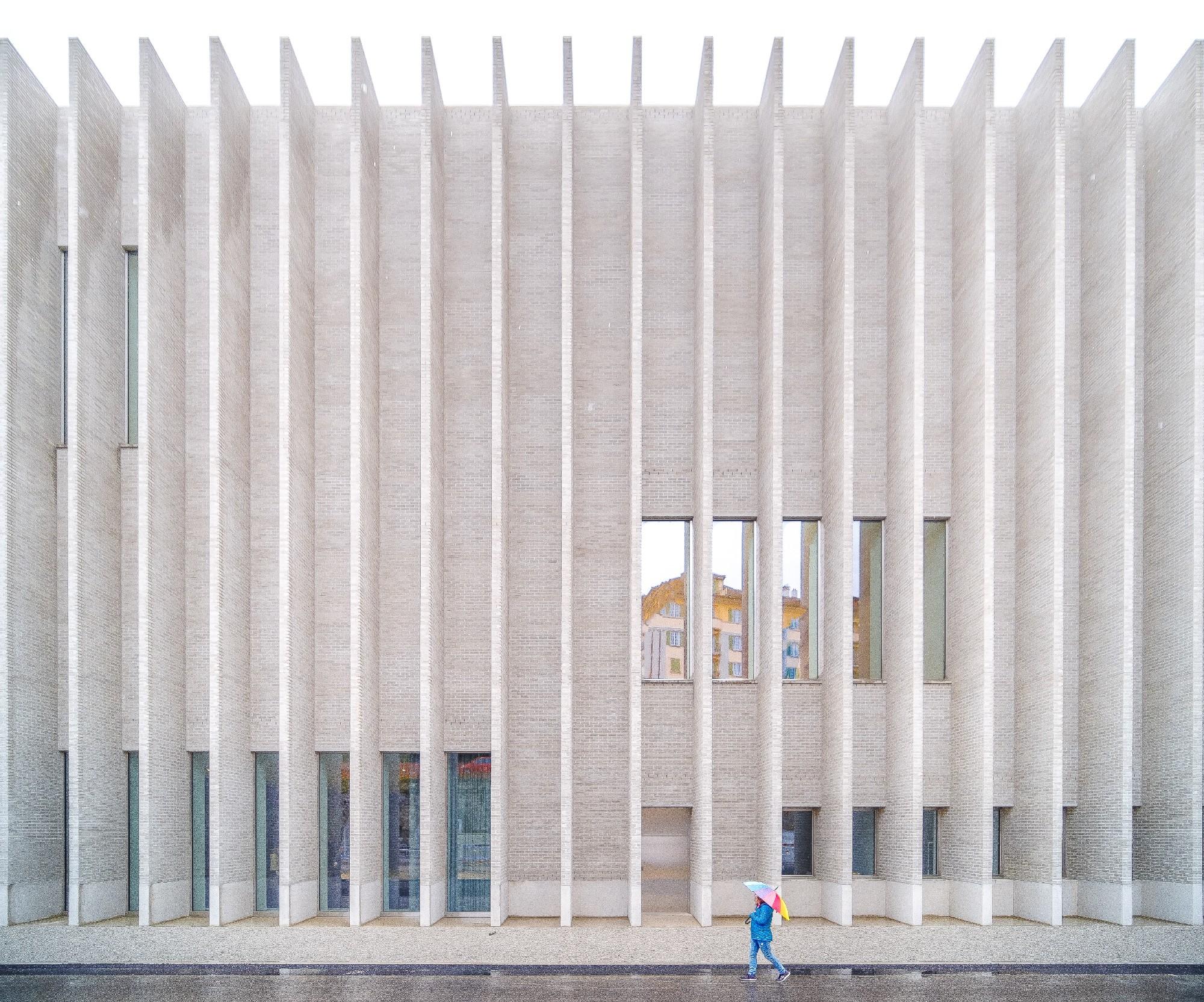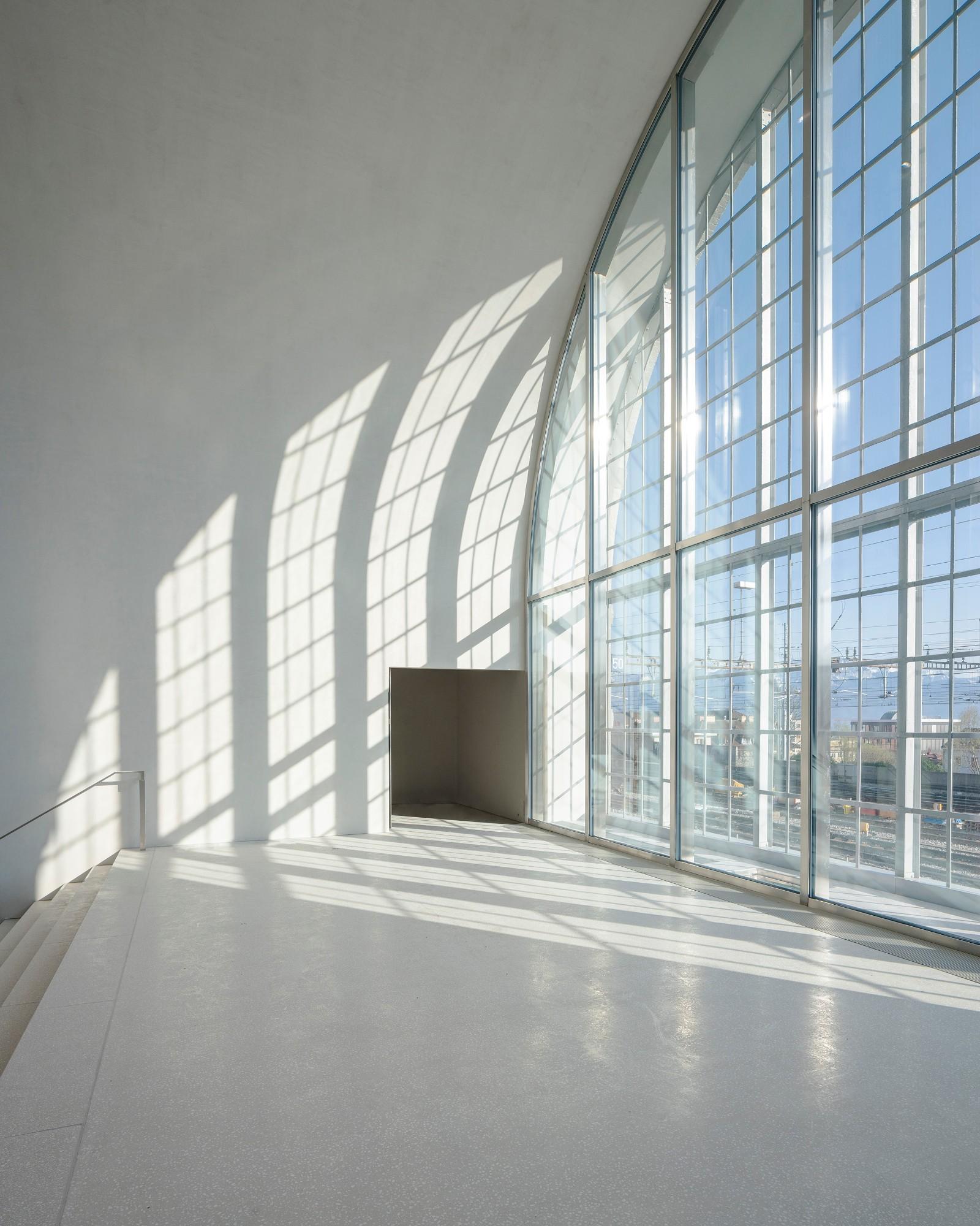 The new structure is monolithic and textured, with pilastered openings, a broad courtyard, and immense windows offering views of Lake Léman and the Jura mountains. The building contains the gable of the train station shed—a site-specific nod to the rail-side location and the area’s industrial past. Carefully-considered architectural features invite community engagement, reflect the natural environment, and invoke the city’s aims for its future artistic legacy.
