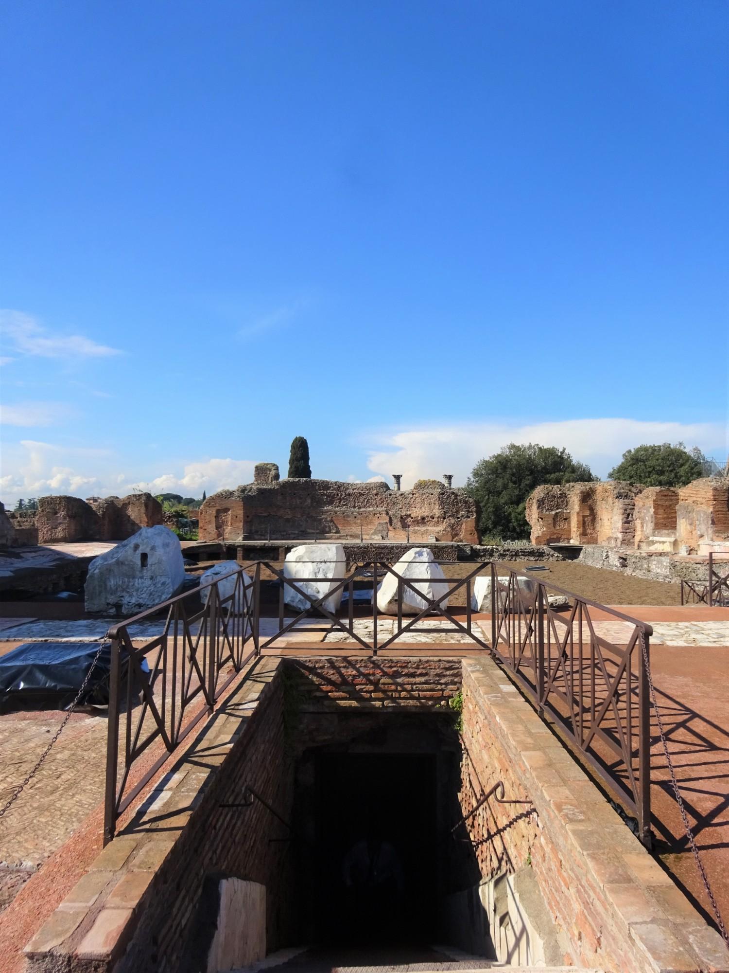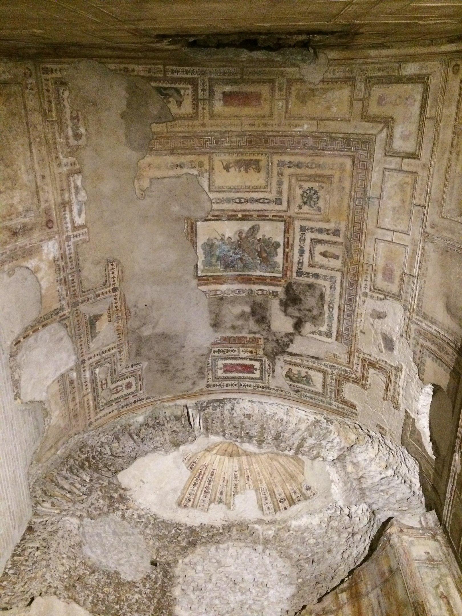 Through a hole in the floor of a dining pavilion built by the later emperor Domitian, you descend an ancient marble staircase into a subterranean space where a series of rooms are arranged around what was once an open-air court. Along one wall runs the partial remains of an elaborate water feature designed in imitation of the stage backdrop of a Roman theatre, with regular niches flanked by miniature marble columns, in front of which fountains squirted water into the air. The floor of the court is paved in geometric patterns of colored marble brought from across the empire, while the walls and ceilings of the adjacent rooms still preserve frescos of figural scenes surrounded by elaborate borders and spiraling floral designs.