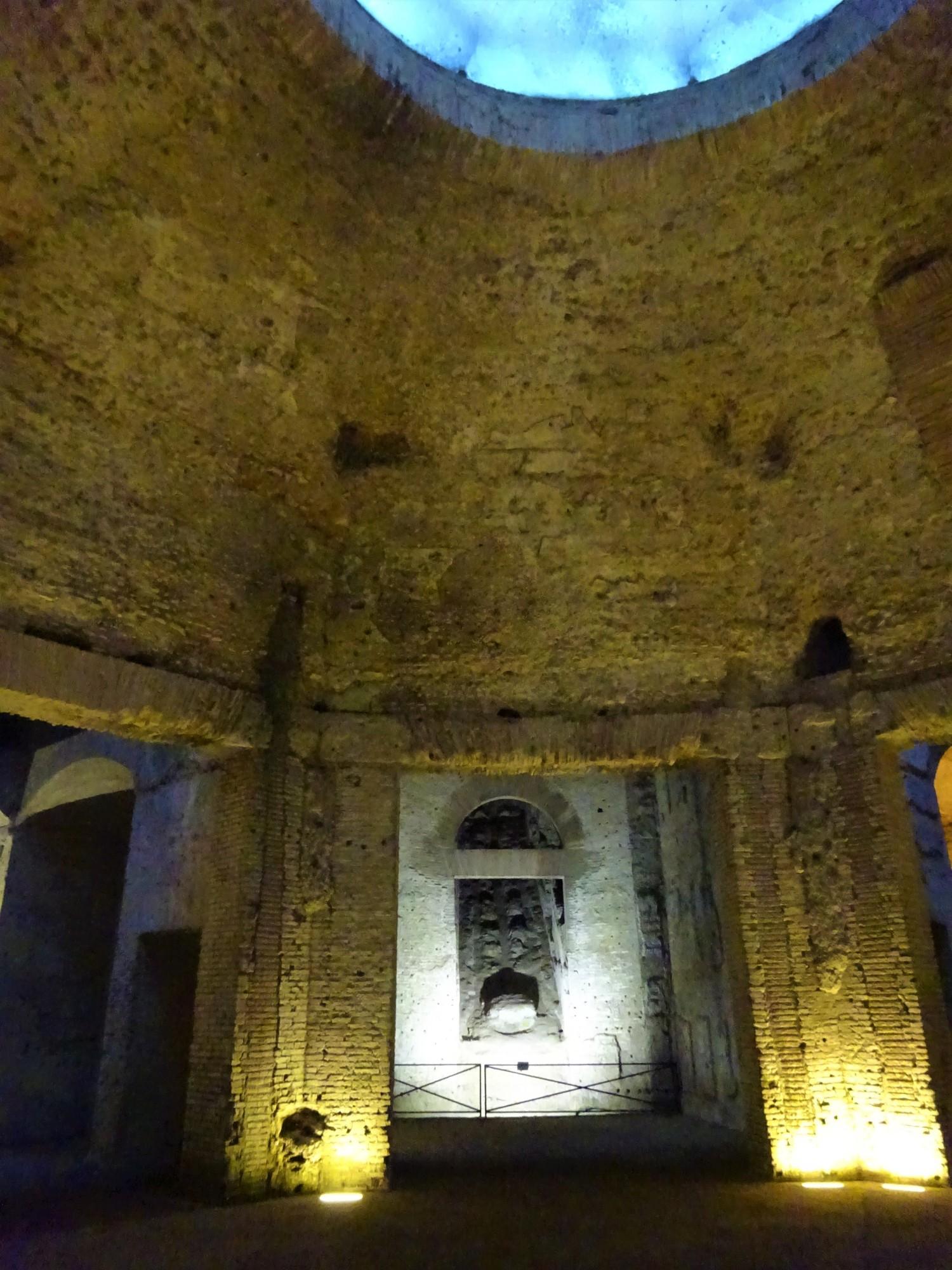 Yet the inventiveness of the architecture is still apparent. Most spectacular, although stripped bare of any decoration, is a suite of dining rooms arranged around an octagonal court. This central space is covered by an expansive concrete dome with a twenty-foot-wide circular opening (oculus) in the middle, allowing natural light to flood in. It has been suggested that this was the famous room known from the Roman biographer Suetonius, who describes a dining hall with a ceiling decorated to resemble the heavens and which constantly rotated day and night; although this identification is also disputed and it is unclear how such a contraption could have worked in the space.