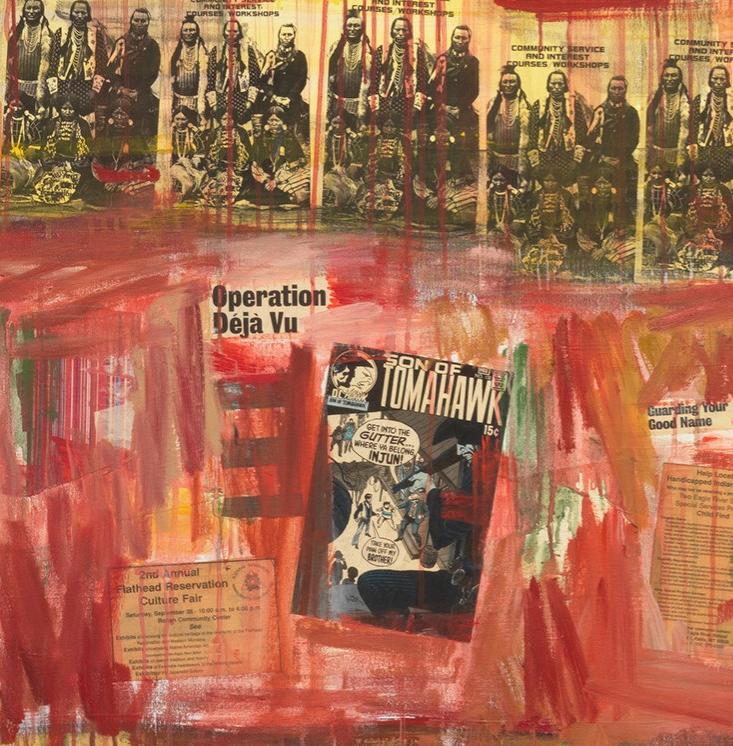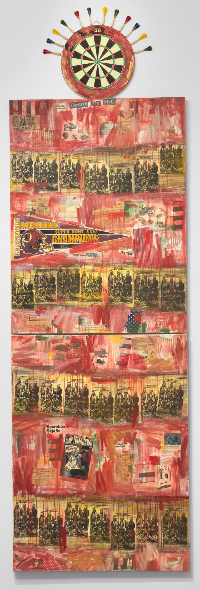 I See Red: Target is a towering eleven-feet tall. Referencing Jasper JohnsTarget paintings (one of which is displayed nearby) and Robert Rauschenburg’s layering of images in his assemblages, the height of the image also suggests a monument or totem pole. Using mixed media, Quick-to-See Smith juxtaposes historical images of real Native Americans as well as ephemera from her own life with portrayals of “Indians” in pop culture, advertising, and the media at large.