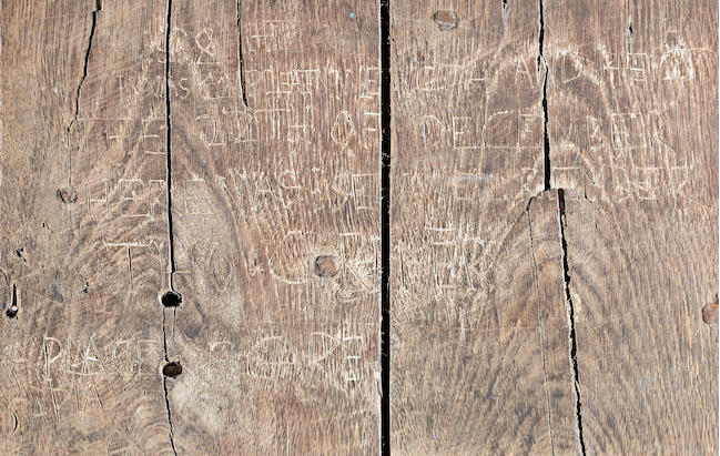 Lacking the appropriate spray paint, these 17th-century graffiti artists used whatever sharp object was at hand. What did these creative inmates commit to the ages? One carved a gallows with a hanged man and a flanking ladder; either he was contemplating his ultimate fate, or he was trying to drum up a game of hangman. Another jailbird offered a delicate illustration of three crosshatched birds. A third simply stated: “1638 … The 22th December … Here was I … Tho*Crimer.” Perhaps Thomas was guilty of etching all of the graffiti himself. What else he was guilty of we do not know.