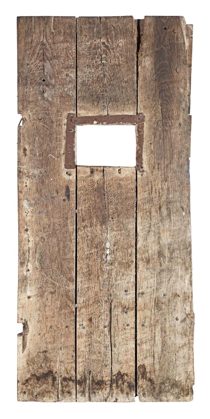 As one would expect, the semi-annual Oak Interior auction at Bonhams London is chockful of sturdy chairs and clunky chests. There’s also plenty of antique iron, brass, pewter, stone, and copper–if you happen to be furnishing a castle, this is the sale for you–but the lot with the most presence is this rough-hewn English oak jail door dating from the 1630s (or earlier) and showing “fascinating and macabre prisoner graffiti,” according to the auctioneer.