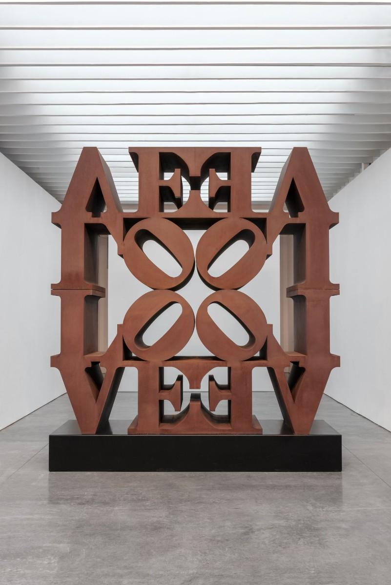Indiana’s original LOVE sculpture, inspired by earlier hard-edged paintings, stacks bold uppercase lettering with an off-kilter O. Commissioned in 1970, Indiana’s LOVE sculpture resonated deeply with audiences. LOVE WALL (1966-2006) joins four of Indiana’s classic LOVE compositions in a mirrored formation, with the four Os joined at the center. The 12ft high LOVE WALL is built of Cor-ten steel, a durable, distinctly rust-colored industrial material Indiana originally used for his first monumental LOVE sculpture.