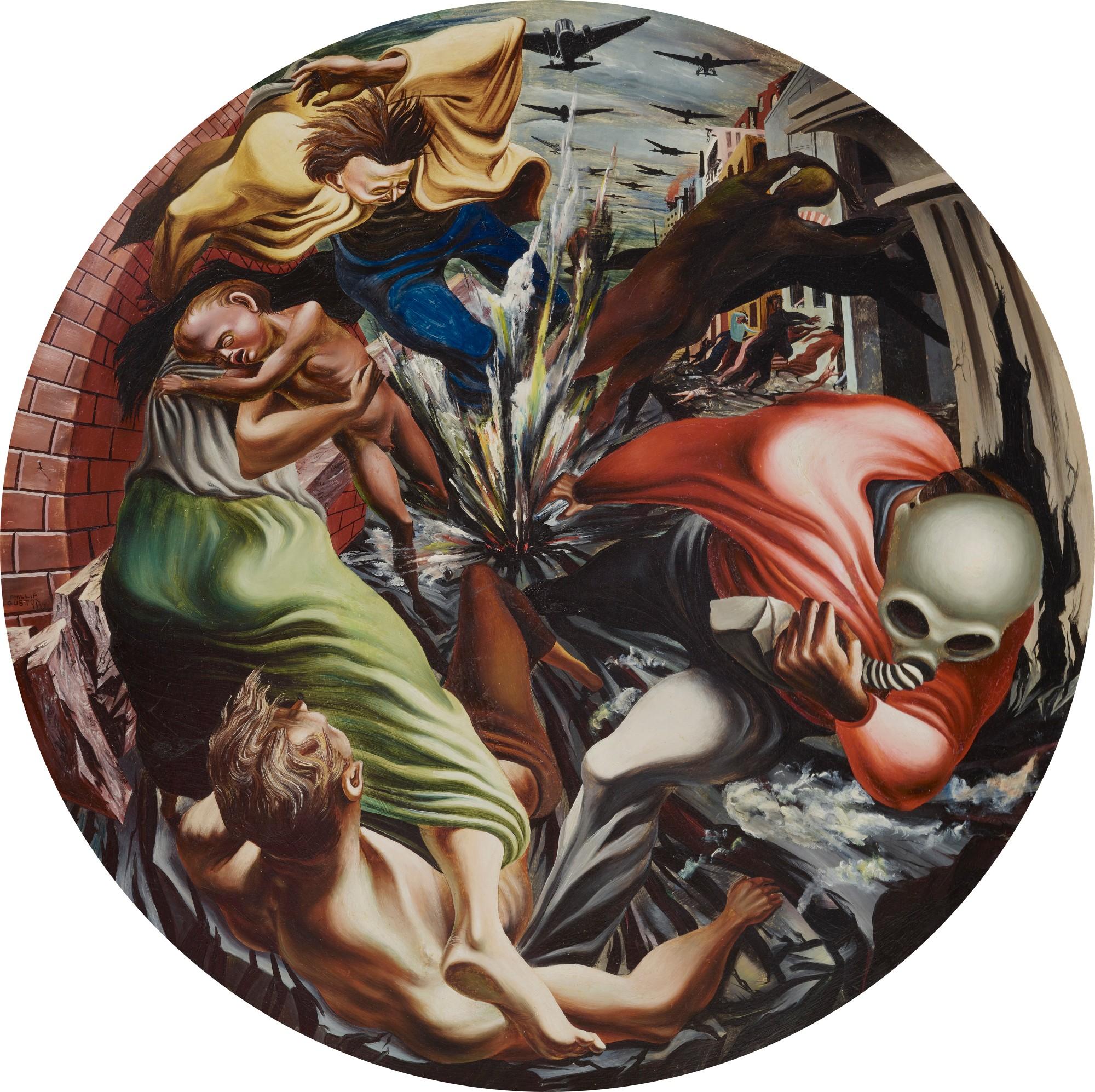 Philip Guston, Bombardment, 1937. Oil on panel. Diameter: 42 in. Philadelphia Museum of Art.