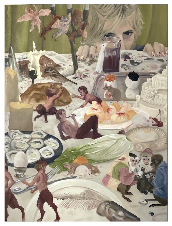 Romane de Watteville, À Table avec les Satyres, 2024. Oil on canvas, 31.5" x 23.625" x 0.75" (80.01 cm x 60.01 cm x 1.91 cm). Courtesy the artist and Ciaccia Levi, Paris and Milan