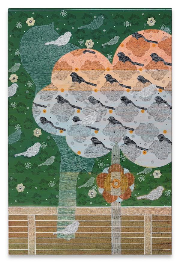 Blurring the line between abstraction and figuration, the graphic paintings in Goldberg’s current An Other Place series—presented at the fair in the shared space of The Approach from London and Los Angeles’s Chris Sharp Gallery—depict repeated, ghostly images of birds in imaginary landscapes, where everything is composed from thousands of tiny painted dots, which sublimely recall stitches in woven textiles.
