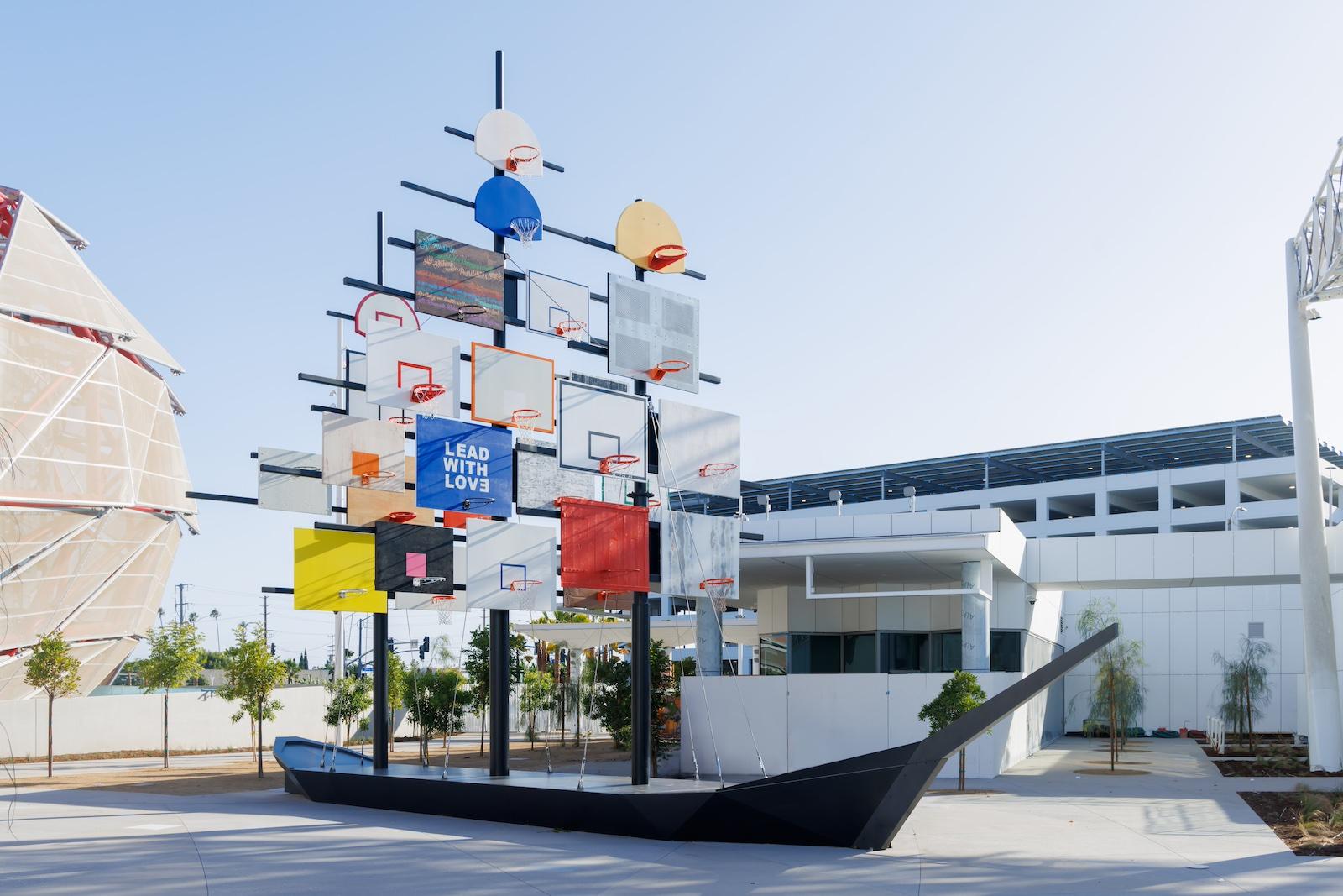 Glenn Kaino, Sails, 2024. Concrete, stainless-steel armature, wood, basketball hoops, paint, 41 ft. 7.25 in. x 28 ft. 11.25 in. x 58 ft. 10.5 in.