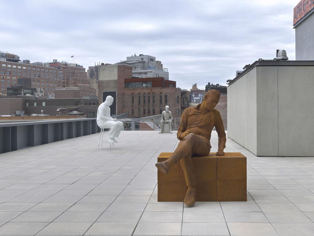 Best in show, however, goes to Charles Ray’s trio of figurative sculptures stationed outside on the fifth-floor terrace. With features smoothed to mannequin-like uncanniness, each monumentalizes some quotidian activity: A guy holding a burger, immortalized in painted bronze; another piece, in Corten steel, of an average joe sitting on a stack of beer cases; and still another that suggests what might have happened if the mirrored, liquid-metal robot from Terminator 2 had frozen into a pensive pose.  And for sheer weirdness, it’s hard to beat Alex Da Corte’s video installation, which morphs an homage to Brancusi into Pee-Wee’s Playhouse.