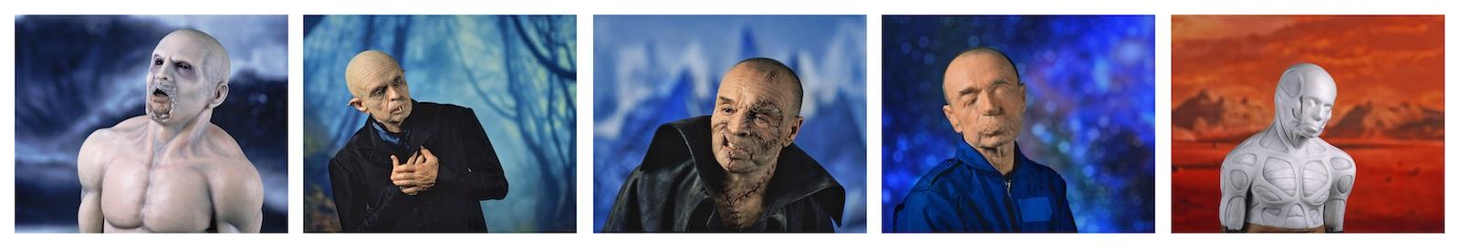 Elsewhere, Daniel J. Martinez is given his own room to present a series of color photos of himself laden with prosthetics to resemble a rogue’s gallery of auteur monstrosities: The Engineer from Ridley Scott's film, Prometheus; Dracula from Werner Herzog's Nosferatu the Vampyre; the titular creature from Kenneth Branagh's version of Frankenstein; and the shape-shifting alien bounty hunter and Drone Host from TV’s The X-Files and Westworld.