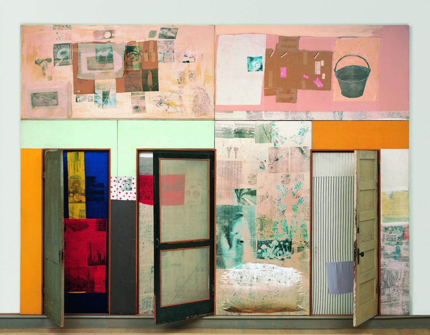 Robert Rauschenberg, Rodeo Palace (Spread), 1975-76, solvent transfer, pencil, and ink on fabric and cardboard, with wood doors, fabric, metal, rope, and pillow, mounted on foamcore and redwood supports, 144 × 192 × 5 1/2 in., collection of Lyn and Norman Lear, Los Angeles, © Robert Rauschenberg Foundation