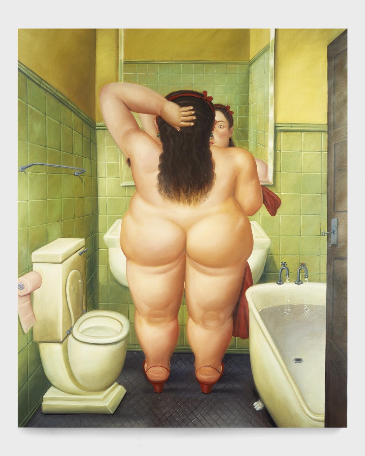 The next two floors are disarming not only because they reveal so many barebacks and backsides but also because they show how we should be looking seriously at works we might normally dismiss, or disdain. One such work is Fernando Botero’s parodic painting The Bathroom which features a massive woman regarding herself in a mirror surrounded by a toilet, sink, and tub in all their architectural solidity. The interior’s curves echo hers, while a slice of her reflection to the right shows her slyly capturing us spying.