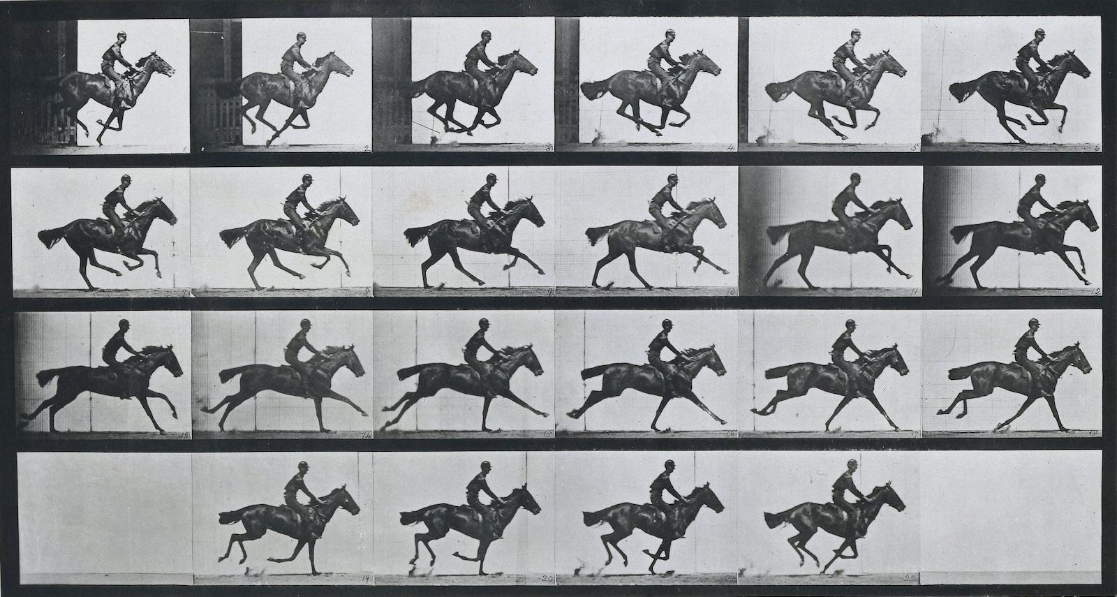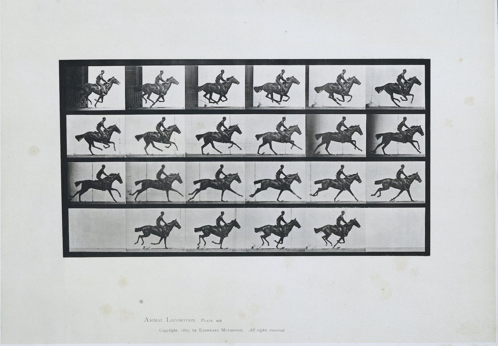 This is the question that photographer Eadweard Muybridge grappled with in 1887, when he set up twenty-four trip wires to photograph a racehorse, named “Bouquet,” galloping with the help of a rather aggressive jockey.