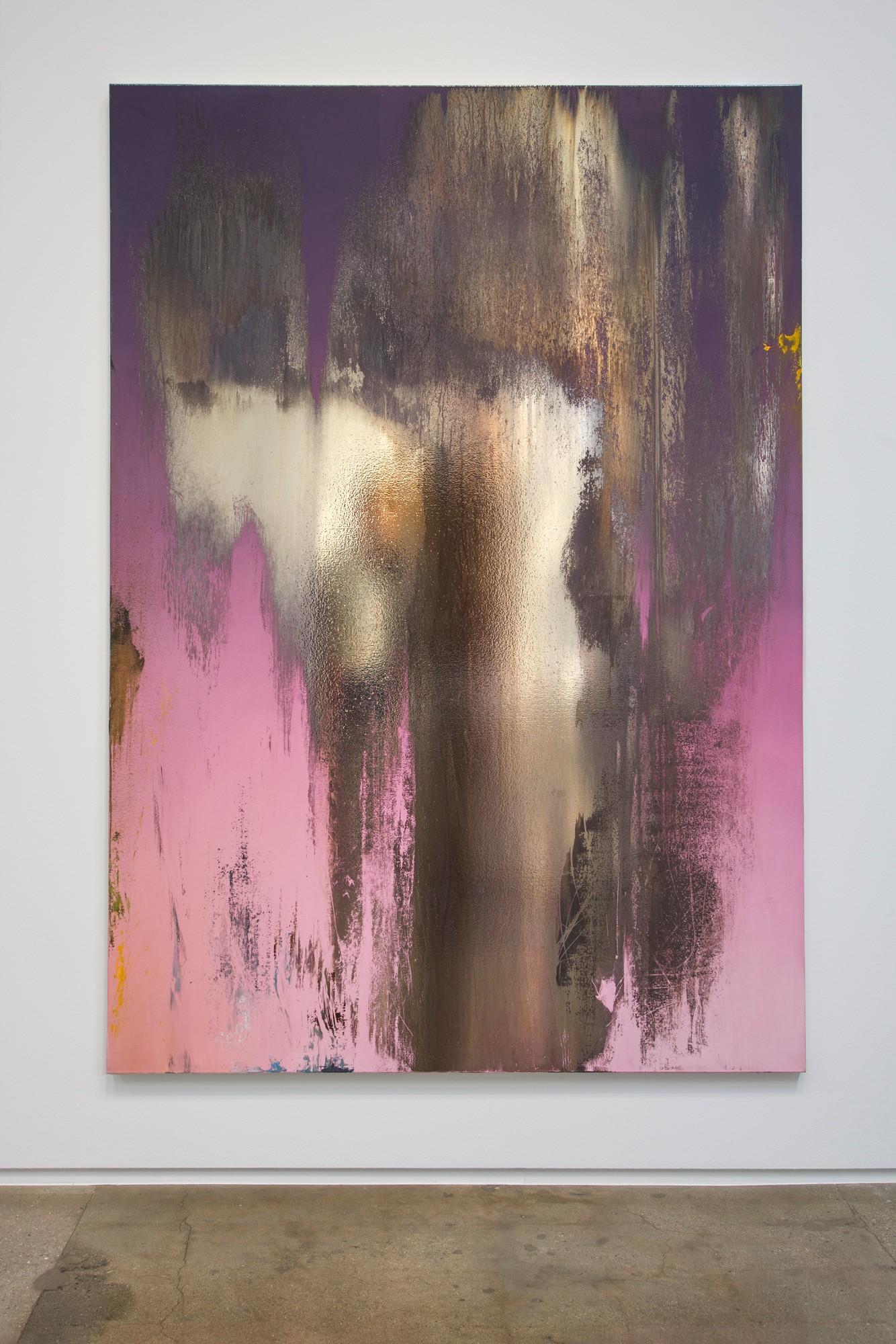 In paintings like The Life We Left Behind (7), which flaunts a background of gradated bands of purple, lavender, and pink, and The Life We Left Behind (4), which reveals the colors of a sun setting in a blue sky, the underpainting is exposed through a variety of deconstructive means. After abstractly painting the grounds, Hod and his team painstakingly apply a coat of chrome pigment, which he then brutally wipes and scrapes away. Initially inspired by Andy Warhol’s Shadow paintings yet poetically linked to the aging canvas in Oscar Wilde’s The Portrait of Dorian Gray, Hod’s reflective paintings sport their ruin while inviting one to contemplate his own likeness and impending mortality when being absorbed by them.