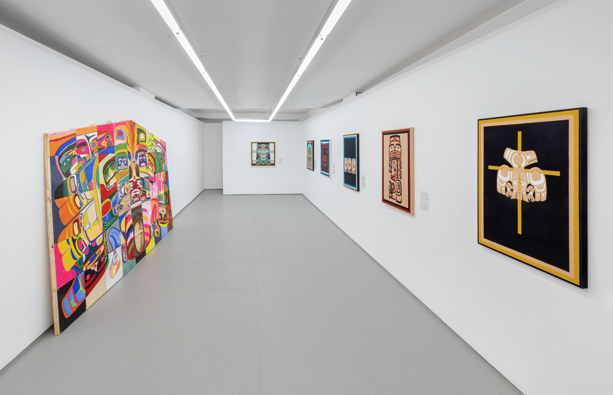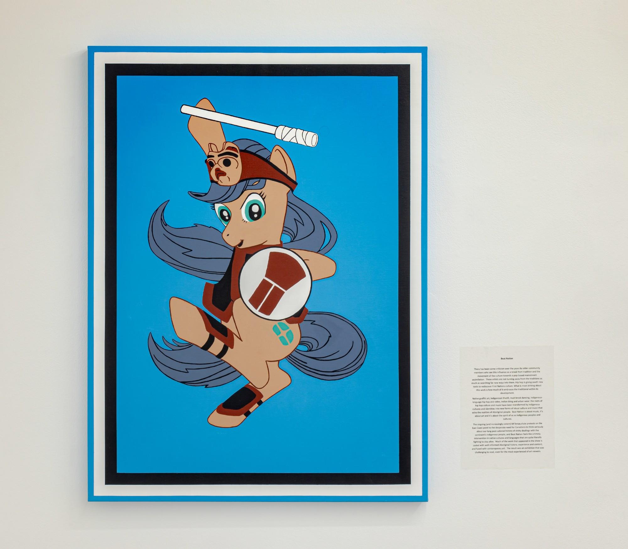 Seven paintings from his 2014 series Re-Contextualizing the De-Consecrated explore the exhibition history of Northwest Coast art by interpreting curatorial statements from past shows as works on canvas with accompanying poetic texts. For example, the point of departure for the painting Beat Nation was a 2012 traveling exhibition, curated by and for Indigenous peoples, that was organized by the Vancouver Art Gallery. In the painting, a cartoon animal character strikes a warrior’s pose while brandishing a mask, club and shield, with the artist’s supplemental text considering the influence of hip hop and graffiti art on First Nations culture.