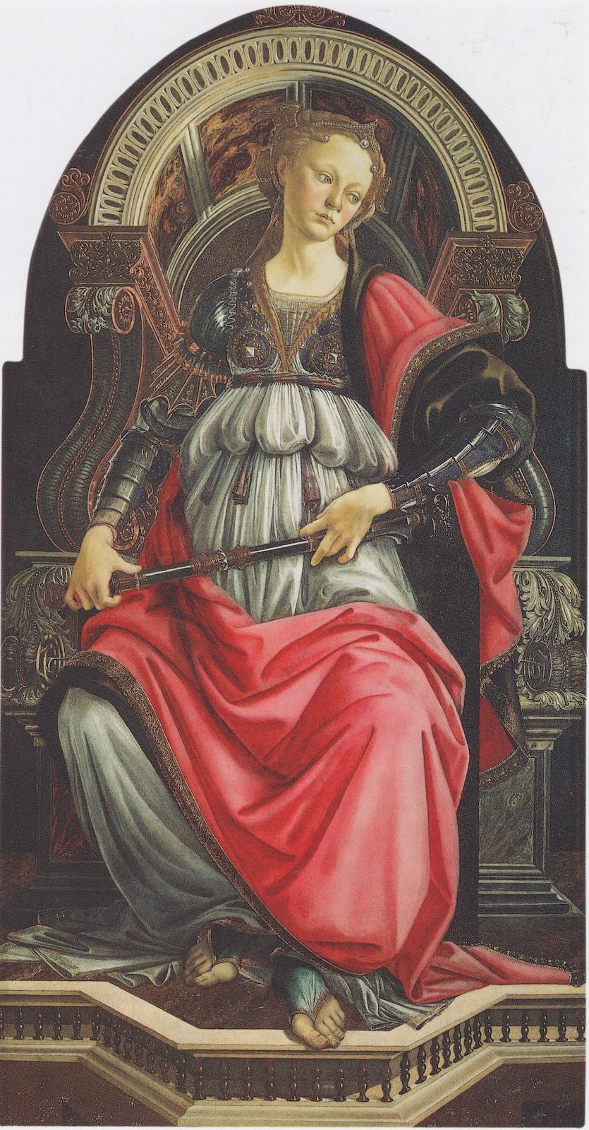 Sandro Botticelli, Fortitude, 1470. Tempera grassa on wood. 65.7 x 34.2 in. (167 x 87 cm).