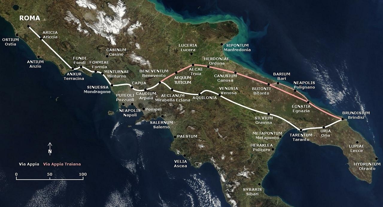The Via Appia, in white, runs from Rome in central Italy down to Brundisium (modern day Brindisi) in the heel of the Italian peninsula. A secondary deviation of the road, marked in red, was constructed under the emperor Trajan in 109 CE. License