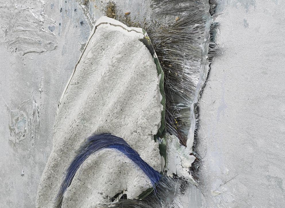Rosy Keyser, Detail of Window Swap, 2020. Aluminum, enamel, sawdust, horsehair, and paper on canvas.