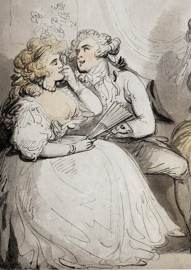 In Rowlandson's work we see the MC making introductions between a rather elderly dandy and two seated ladies. Sporting enormous wigs and feathered headdresses, they themselves look to be past their prime. To the right, we see a group of rather well upholstered ladies who are dancing, as the Bonhams cataloguer kindly puts it, with rather more enthusiasm than grace. At left we see an amatory dalliance in progress–one in which the fan-wielding young woman does seem in some danger of busting out all over, so to speak.