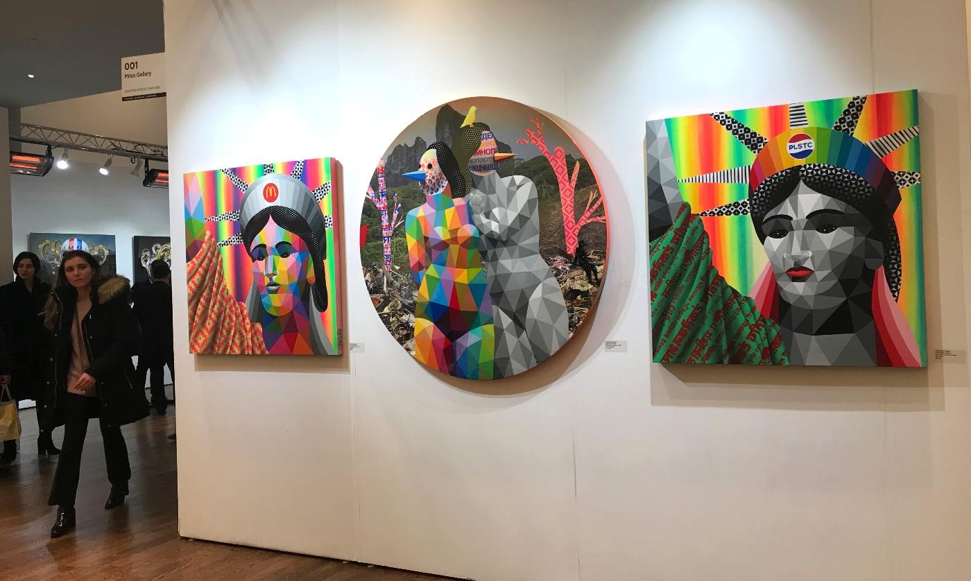 “Everything photographs so well!” is the first impression one could get after a first round of the 60 international exhibitors of the 19th edition of SCOPE New York, held at the Metropolitan Pavilion in Manhattan. The press preview allowed for close examinations of several booths, and one thing that can be said with utter confidence is that much of the art would translate well on social media. While the vivid colors that made up the majority of artworks are refreshing to see without the distortion of the iPhone camera, one could clearly see how the sleek curves of the more minimalistic works and the intricate, but harmonious details of the more elaborate ones could translate well on Instagram. Prime examples of this include Okuda San Miguel’s work, which greets you upon entering the pavilion, and combines rainbow spectrums and grayscale gradients. Further into the maze-like structure of the booths, we find Amsterdam’s Kers Gallery has created a multi-colored playground combining paintings and installations.