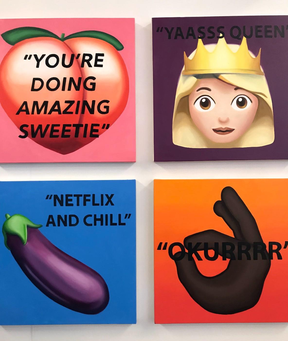 The Kaplan Twins, represented by Roman Fine Art, had a series of 24”x24” canvasses that presented, in this order, a solid background, an emoji, and a phrase that became common parlance. the peach emoji, for example, is paired with a rosewood-colored background and the phrase You’re Doing Amazing, Sweetie, popularized by Kris Jenner.