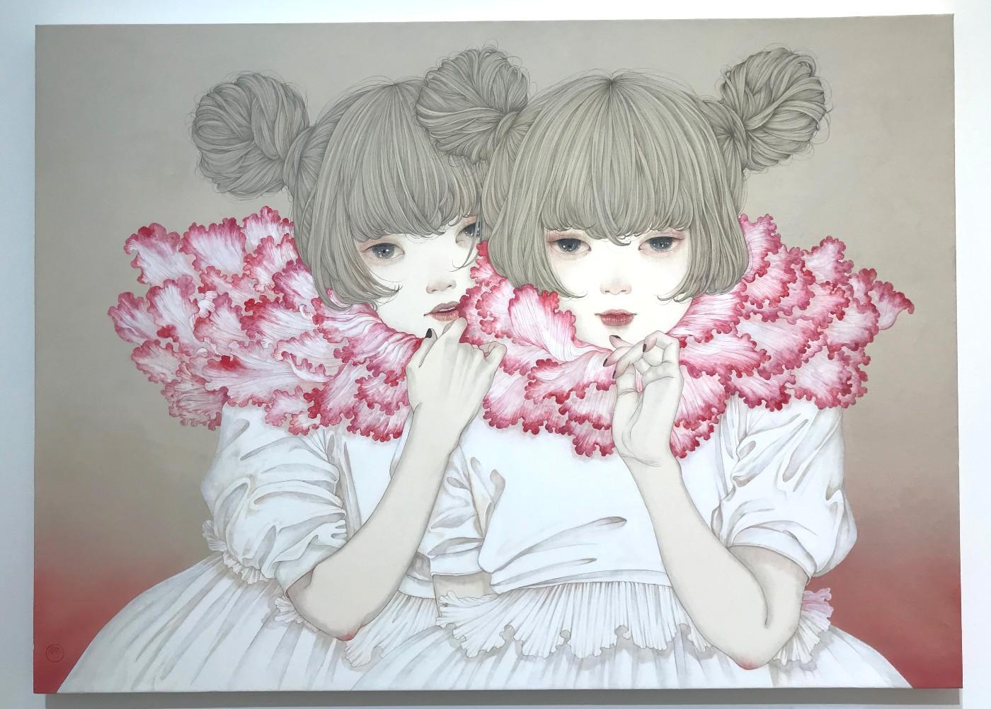 As someone who became interested in art through that unorthodox channel that is Japanese animation, I was thrilled to see a substantial representation of Japanese contemporary artists. Corey Helford Gallery, a beacon in the pop-surrealist scene, showcased, among other things, the bio-luminescent-like works of Kazuki Takamatsu, whose optical-white ethereal subjects float against a pitch-black background, and the filigree-like paintings of Yuka Sakuma, whose painting Cherry presents two little girls, wearing elaborate party dresses whose collars are made of cherry-blossom petals. Kyas Art Salon presented the works of Yoshiyasu Tamura, who, as a nod to both contemporary art and tradition, favors acrylic and gold leaf on canvas to depict female samurai clad in red kimono.