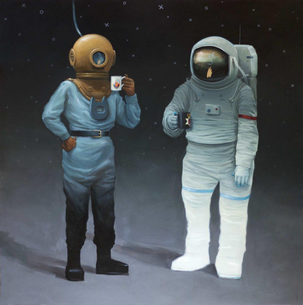 The twin infinities of sea and sky weave through Jeffers’ paintings, creating an ongoing narrative about outer space and our place in the universe. An astronaut in The Stories We Tell floats in the ocean, holding a lit match above the waves, the match and the starlight reflected in the helmet visor. Two astronauts cling to a piano, in Lost at Space, floating away from an iceberg and a sinking, flaming ocean liner reminiscent of the Titanic. In The Rescue, a deep sea diver leaps through the starry night air towards a burning piano, which is triangulated by bright lines of force. The diver and the piano mirror trapeze artists about to perform an acrobatic feat. These recurring characters share a coffee break in A Break with the Unknown, standing together on a flat gray surface that fades behind them into an infinite night sky, their mugs reflected in their helmet visors. The dreamlike logic of his work draws the viewer into a place of introspection, peril and wonder.