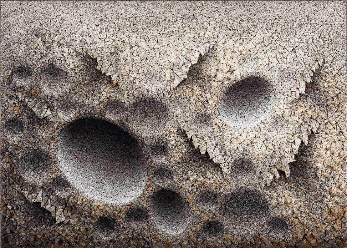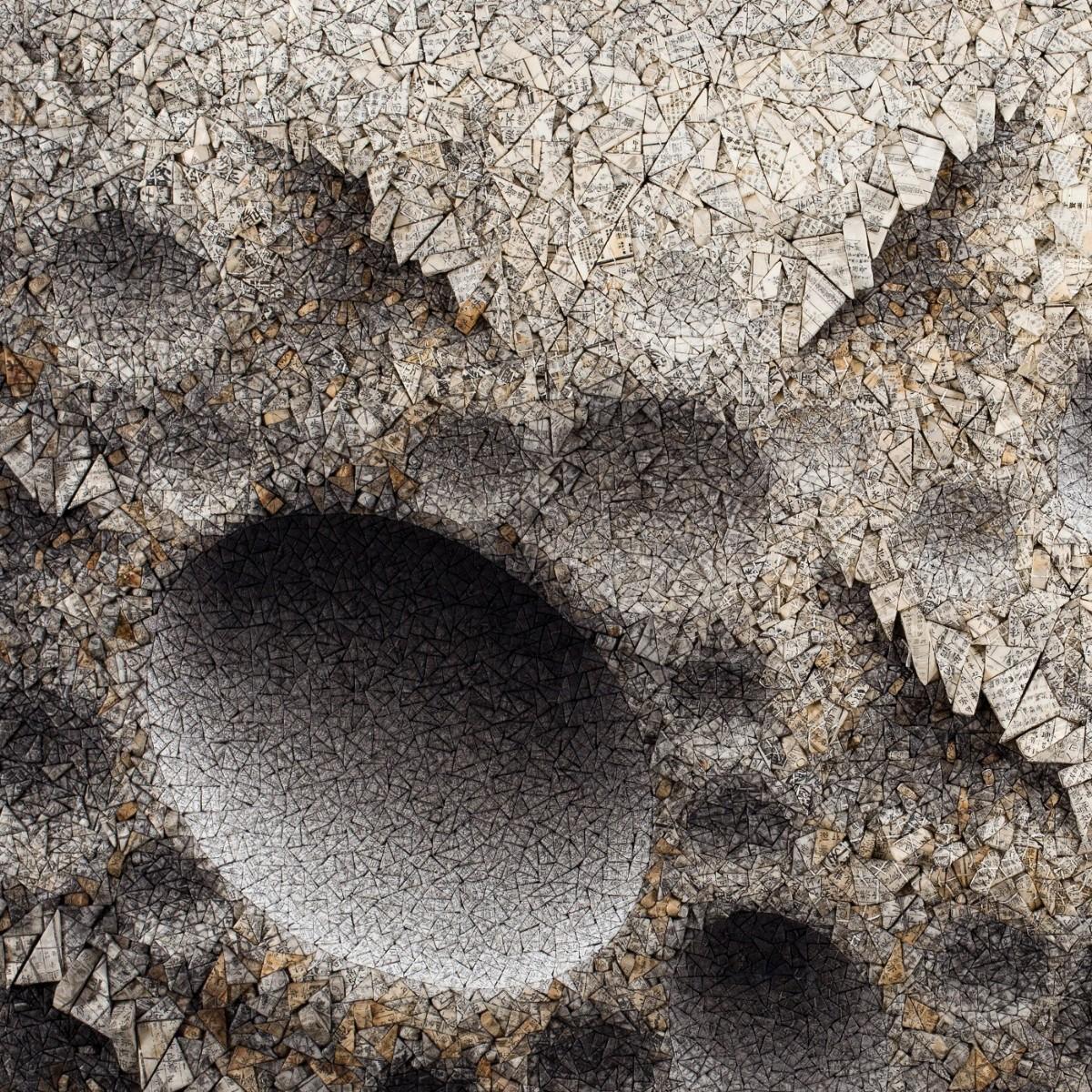 He carefully sources his hanji from antique books between fifty and a hundred years old. “Each has its history and each generation of our ancestors’ joys and sorrows can be seen in the thousands of aggregated fingerprints that make my work even more mystical and precious. It’s almost as if these fingerprints are trying to have conversation with me, to explain their reasons for being there.” His tactile creations resemble geologic formations, calling to mind the limestone hollows of caves, filled with bristling stalagmites and wondrous crystalline growths, or the mysterious cratered surface of the moon.