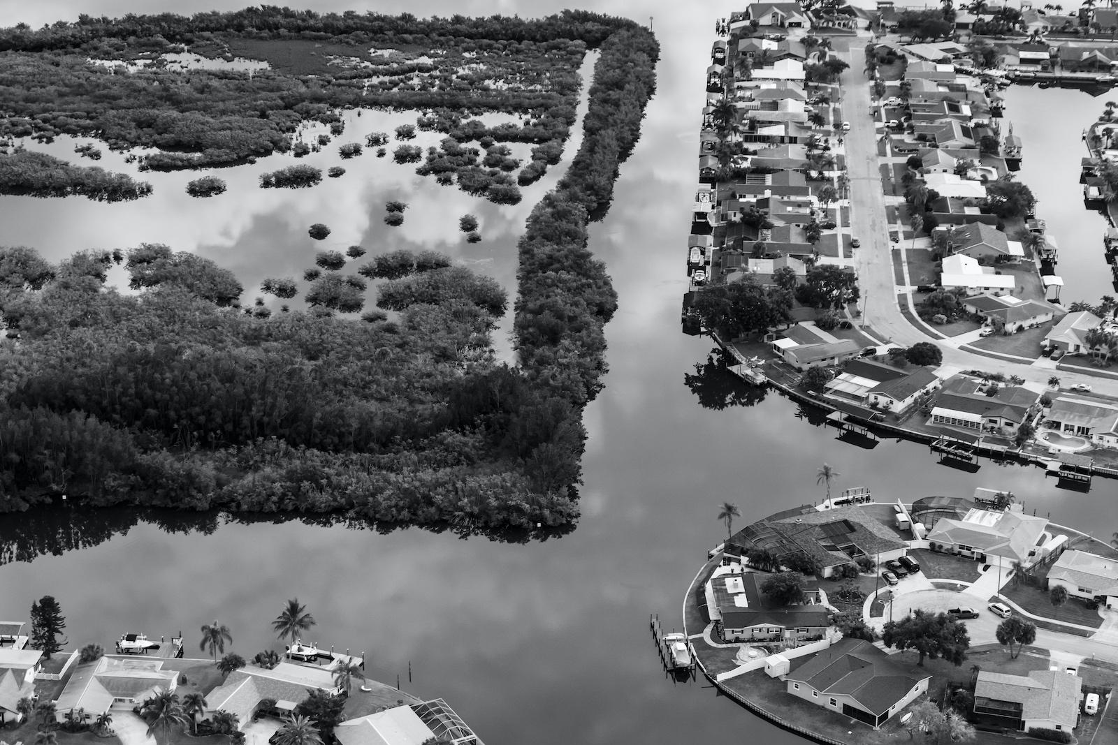 A similar spread in Anastasia Samoylova’s Flood Zones draws a parallel between the outer edges of the wetlands on Key Biscayne, an island off the coast of Miami, and an encroaching housing development. But whereas Freeman examines the global impacts of climate change, Samoylova uses the photographic language to explore the multi-layered nature of the changing environment in Miami. She captures the curious visuals of climate change in the city and the oftentimes bizarre responses to these changes.
