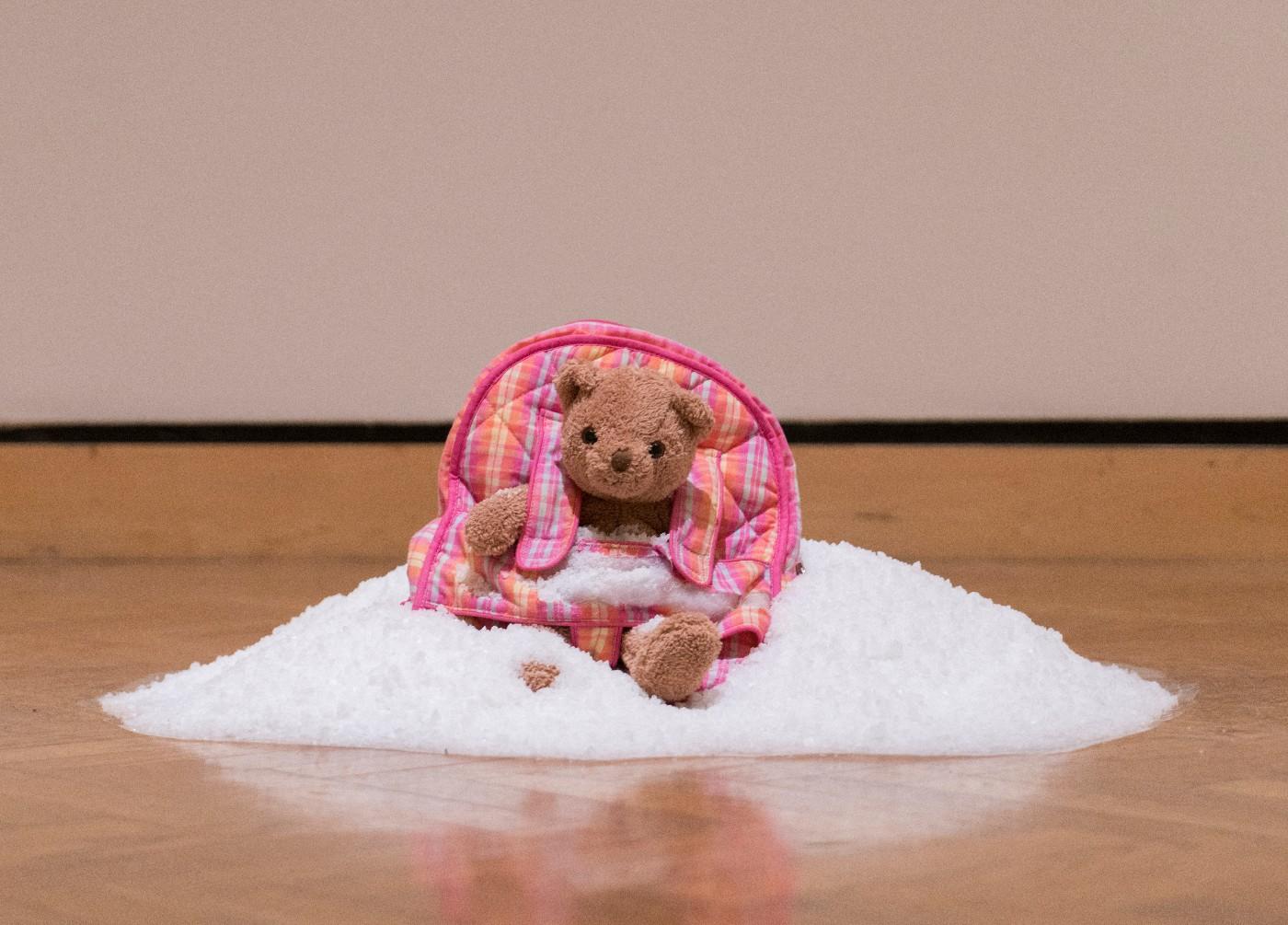 At the entrance of the gallery, a wall-mounted rectangular grid of sixteen videos plays interviews with Syrian refugee children. Many of Imady’s pieces juxtapose imagery of childhood innocence with symbols of loss, strife, challenge and war. In “Pillar of Salt” (2018), a teddy bear wearing a quilted pink-plaid backpack sits on a pile of salt the weight of a child, referencing the story of Lot’s wife and the danger of looking back during an escape. “Coming Home Outfit” (2018) displays a lone child-sized lifejacket, hanging from a padded, be-ribboned sweater hanger, and the plush “Receiving Blanket” is printed with an image of the bombed-out Syrian city Homs. These incongruous pairings evoke both tenderness and horror, conveying the tragedy of war and dislocation. Children are endangered or die, families are torn apart and safe havens can harbor racism and alienation.