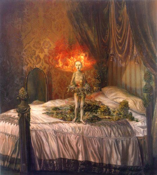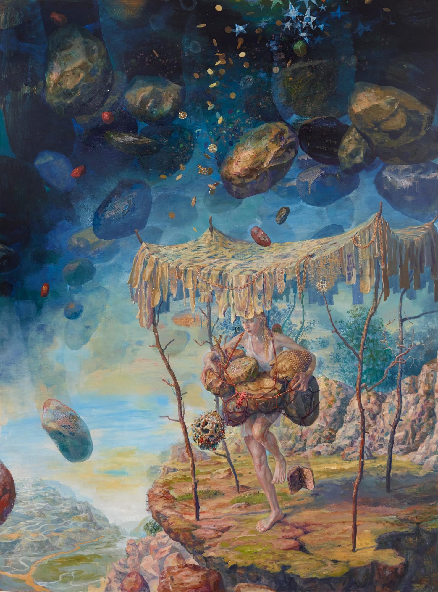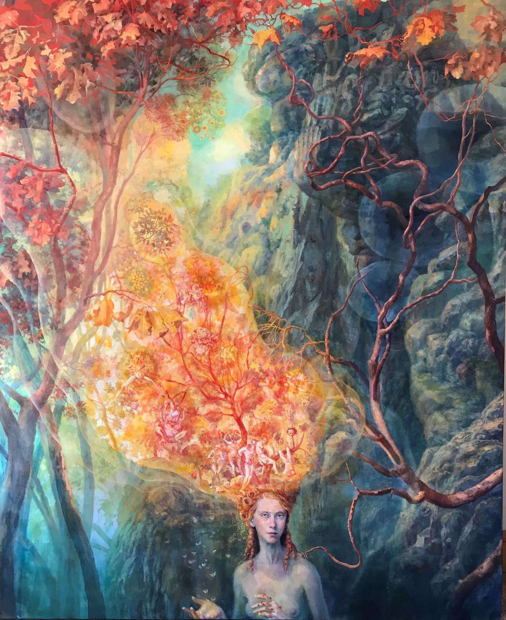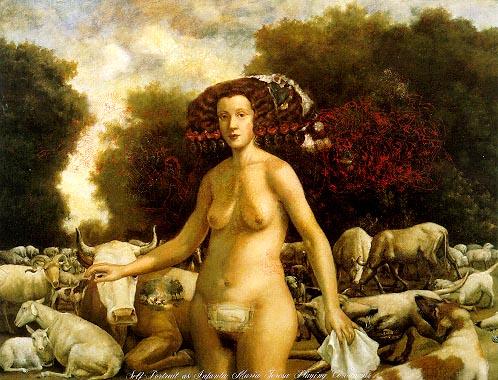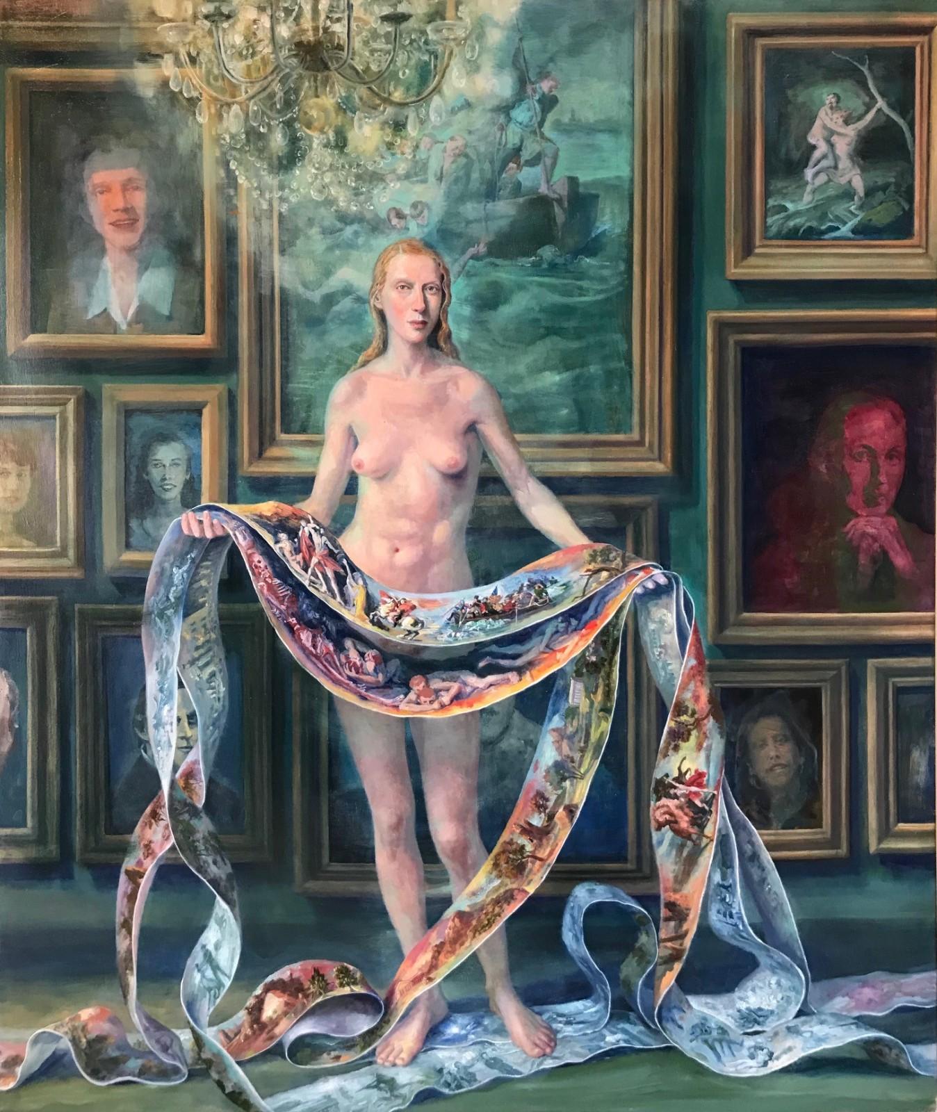 To avoid objectification of the female nude, Heffernan gave her Infanta a direct gaze as Velázquez had done—a straightforward look that was “... always essential to position her as a woman with agency, a confrontational force,” she explained. The self-portrait then became a way of addressing her audience directly: “... presenting myself as a ... host, inviting viewers to enter the worlds I was making, [and] offering them a sense of female subjectivity ....”
