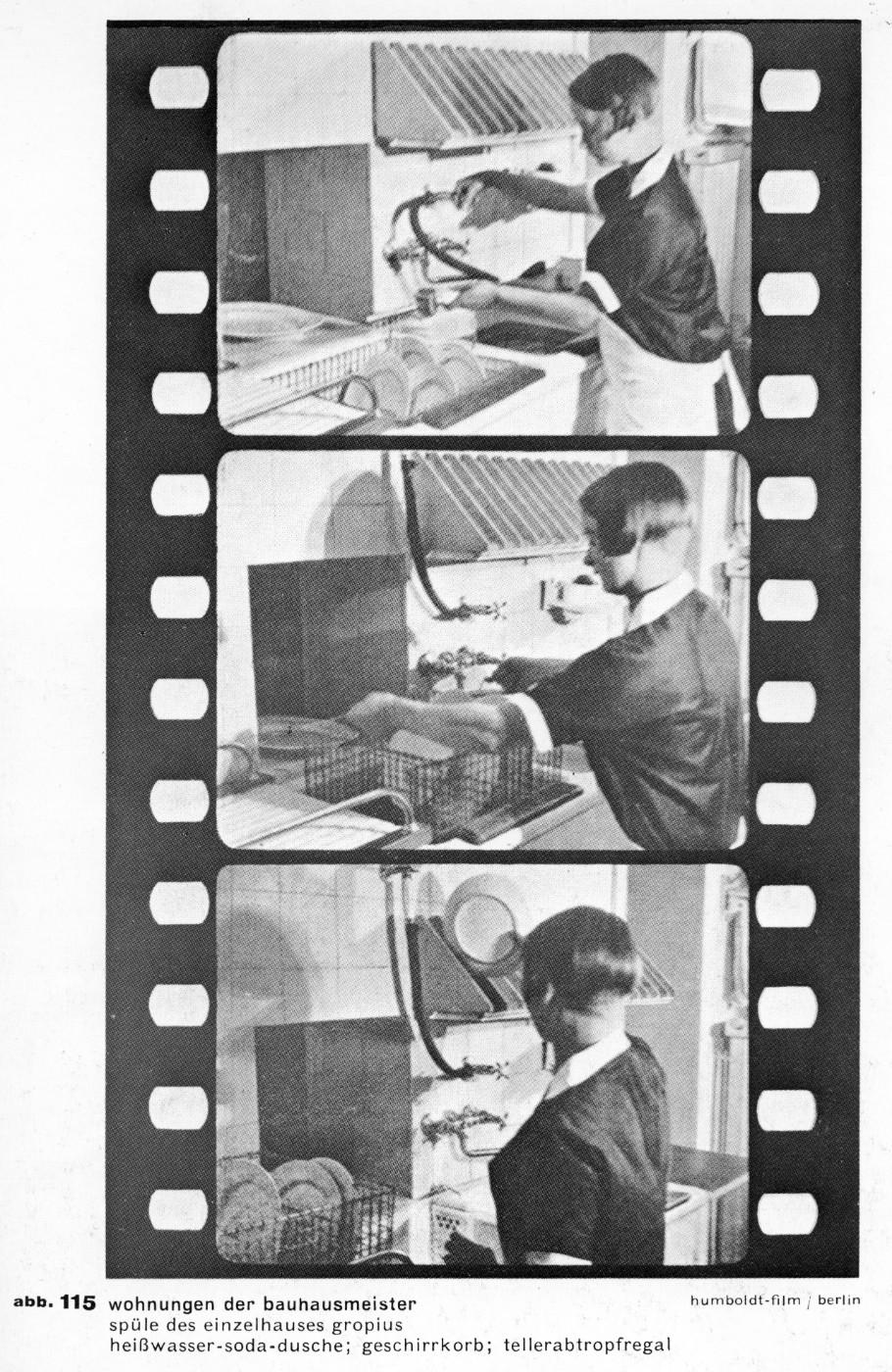 Humboldt Film, Berlin, bauhaus masters houses (wohnungen der bauhausmeister), film stills reproduced in Walter Gropius, Bauhausbauten Dessau (Fulda: Parzeller, 1930) [125]. The caption reads: “kitchen sink of the gropius detached house / warm water–soda–rinse; drainer; plate-drainer shelf."
