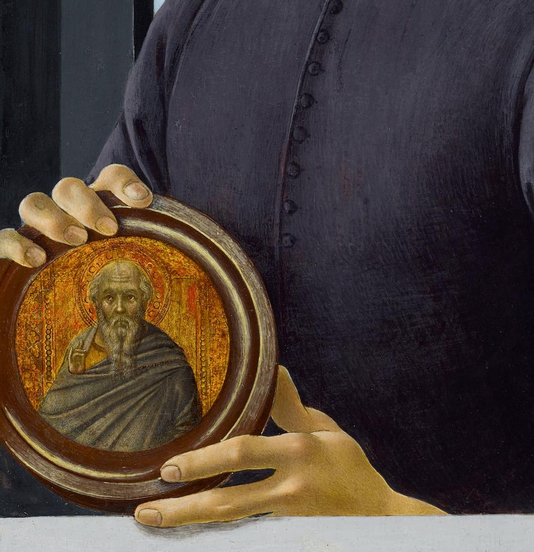 One of the most striking elements of the image is the roundel held in the hand of the young man. The image—of a bearded saint with one hand raised—is in fact a separate painting dated to the 14th century and attributed to the painter Bartolomeo Bulgarini that had been inset into the Botticelli canvas, a technique that was not common at the time.