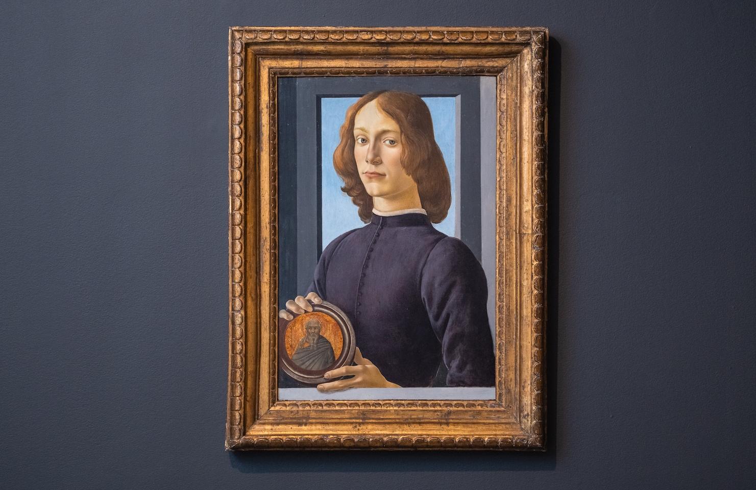 Though Botticelli is most well-known for his large tableaux paintings, Primavera and Birth of Venus, which feature various figures in natural settings, this small portrait depicts a nobleman who, though unidentified, is thought to be a member of the storied Medici family. Framed by a window in a simple blue background that appears almost abstract, the figure looks at the viewer with a directness that was unconventional for the time.