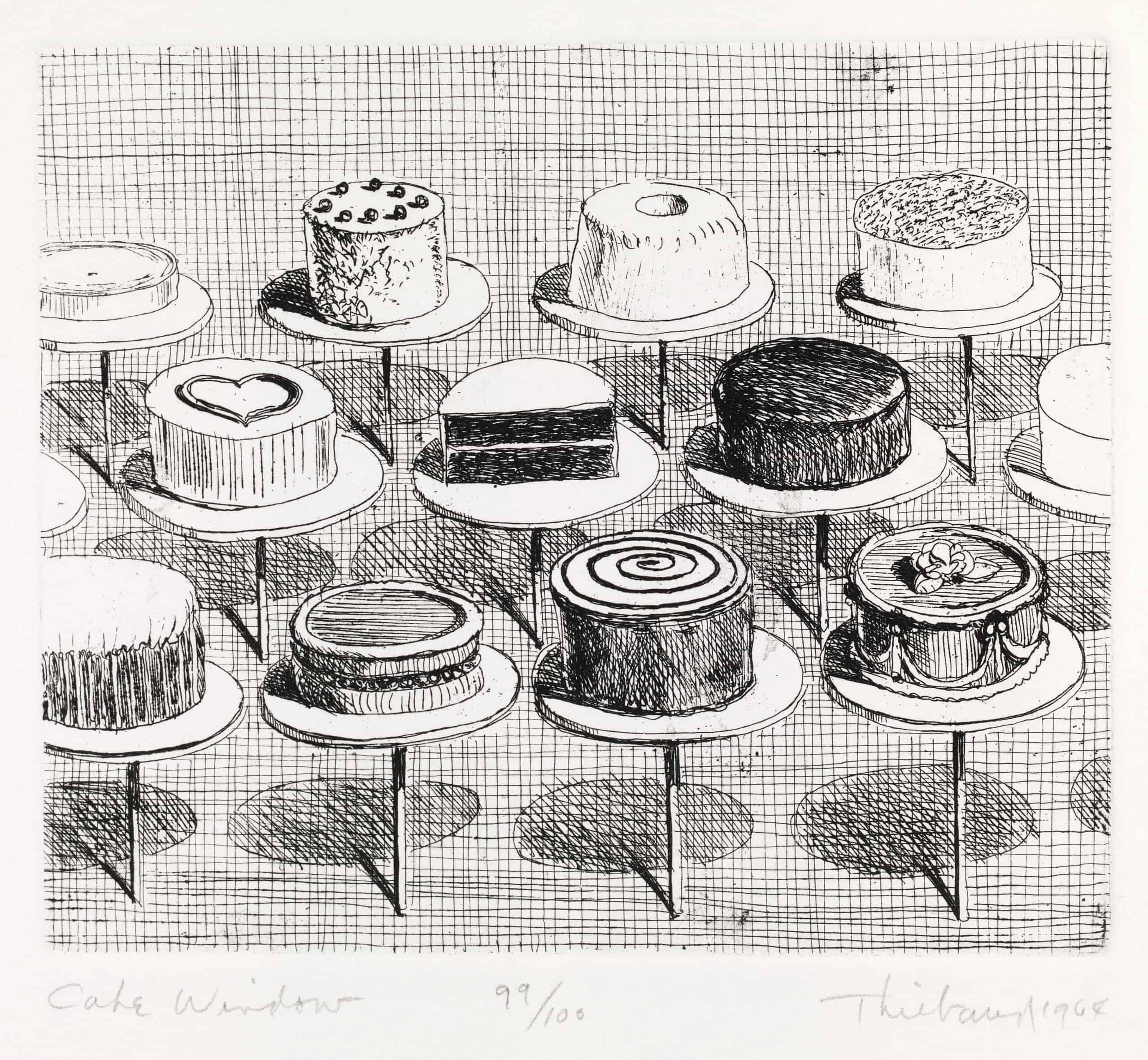 Wayne Thiebaud, Cake Window, from Delights series, 1964. Etching.