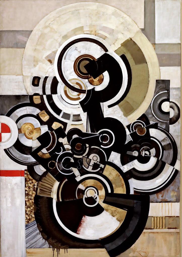 Kupka’s Orphic works incorporate more varied geometrical shapes; his spheres seem to extend forward into the viewer’s space, arranged as they are in front of blocky vertical lines and negative space.