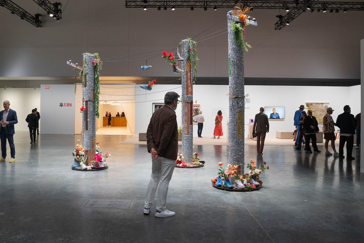 In the Meridians section of the fair, six monumental installations, paintings, and performances are highlighted. One such exhibitor is Kavi Gupta Gallery, a Chicago-based gallery. Kavi Gupta’s mission is to amplify the voices of diverse and underrepresented artists, which is a nice and needed change in both the art world at large and especially in Miami’s art scene. For their Meridians section, they’ve installed Devan Shimoyama’s large-scale installation, “The Grove.” A jewel-encrusted sculptural quartet glitters in the center of the room. In form, they could be trees in a forest, or columns from an ancient temple, but in design, they are an explosion of campy colors and hold an excess of stuff at their stumps. These mismatched shoes and silk flowers are meant to reference community traditions of spontaneous memorials and offer a sense of somber reflection in the face of the divine crystal-covered trees.