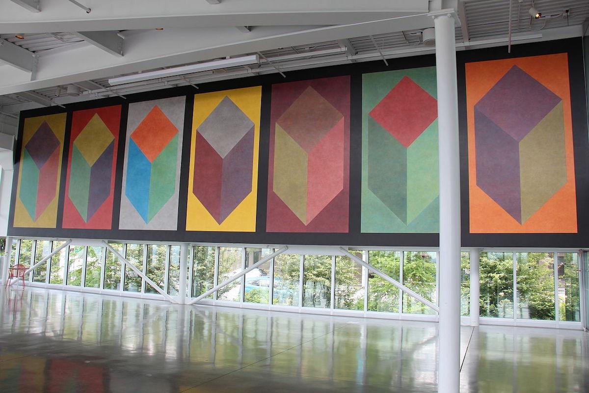 Olympic Sculpture Park’s PACCAR Pavilion in Seattle, Washington was transformed in 2014 into a canvas for Sol LeWitt’s Seven cubes with color ink washes superimposed.