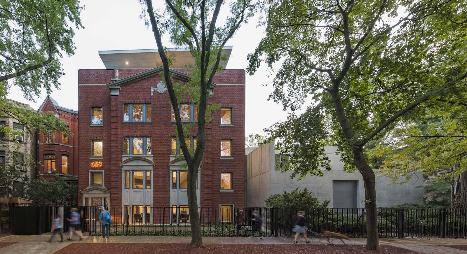 View of the Tadao Ando-designed buildings (from left to right) Wrightwood 659 gallery (2018) and the Eychaner/ Lee House (1997) in Chicago.