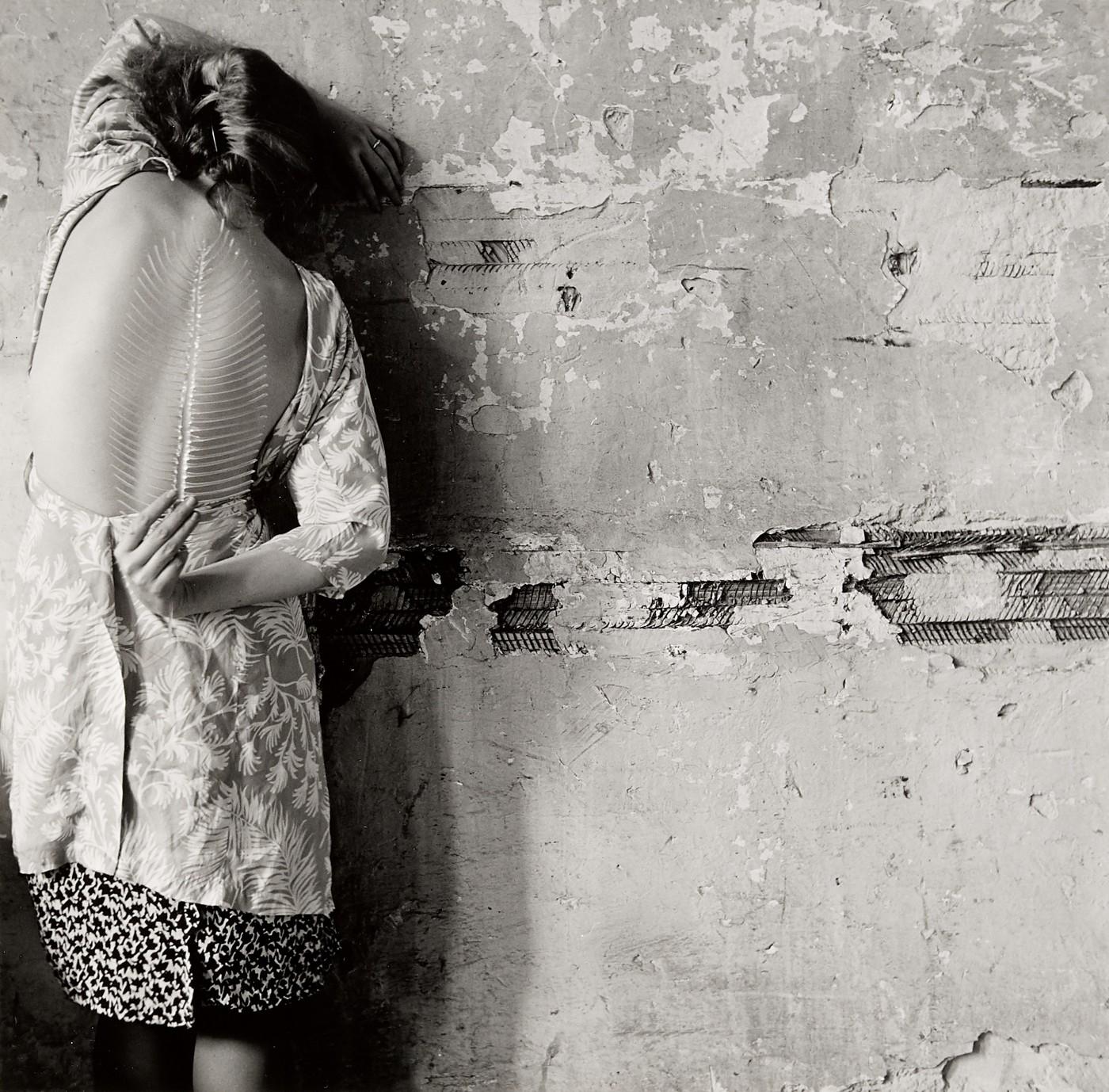 Francesca Woodman (1958-1981) created intimate black and white tableaux primarily using medium format cameras and her unique vision. Providence, Rhode Island strikingly juxtaposes a woman’s bare back with the exposed brick on an old, peeling wall, drawing parallels between the strength and vulnerability of each.