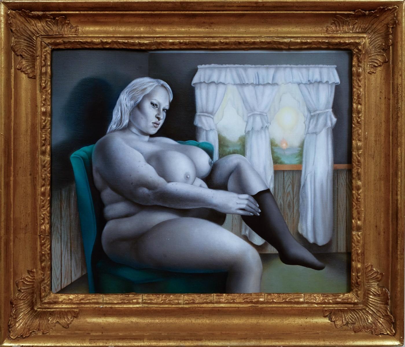 Spending her formative years in the northwest Catskills area of New York state, Farrell utilized the enigmatic strangeness, poverty, and pervasive desolation of this rural locale to influence her aesthetic, particularly color. Moving to the East Village as a teen–a completely opposite landscape–she became fascinated by the nightlife scenes, its dualistic nature, a kind of hide-and-seek, where one can simultaneously lose themselves while finding solace amongst like-minded misfits. Her paintings include representational depictions of real people rendered in her own ‘faux-realism’ style. These painted figures are often left in grisaille or muted limited palettes. Narrative elements are accentuated through visual cues in the form of ordinary objects; everyday clothing, furniture, household items, electronics, wallpaper, lighting slightly askew or emphasized in a different color. There is nothing grandiose about the settings in which these figures live. Their humble surroundings speak of life as a lower class American.