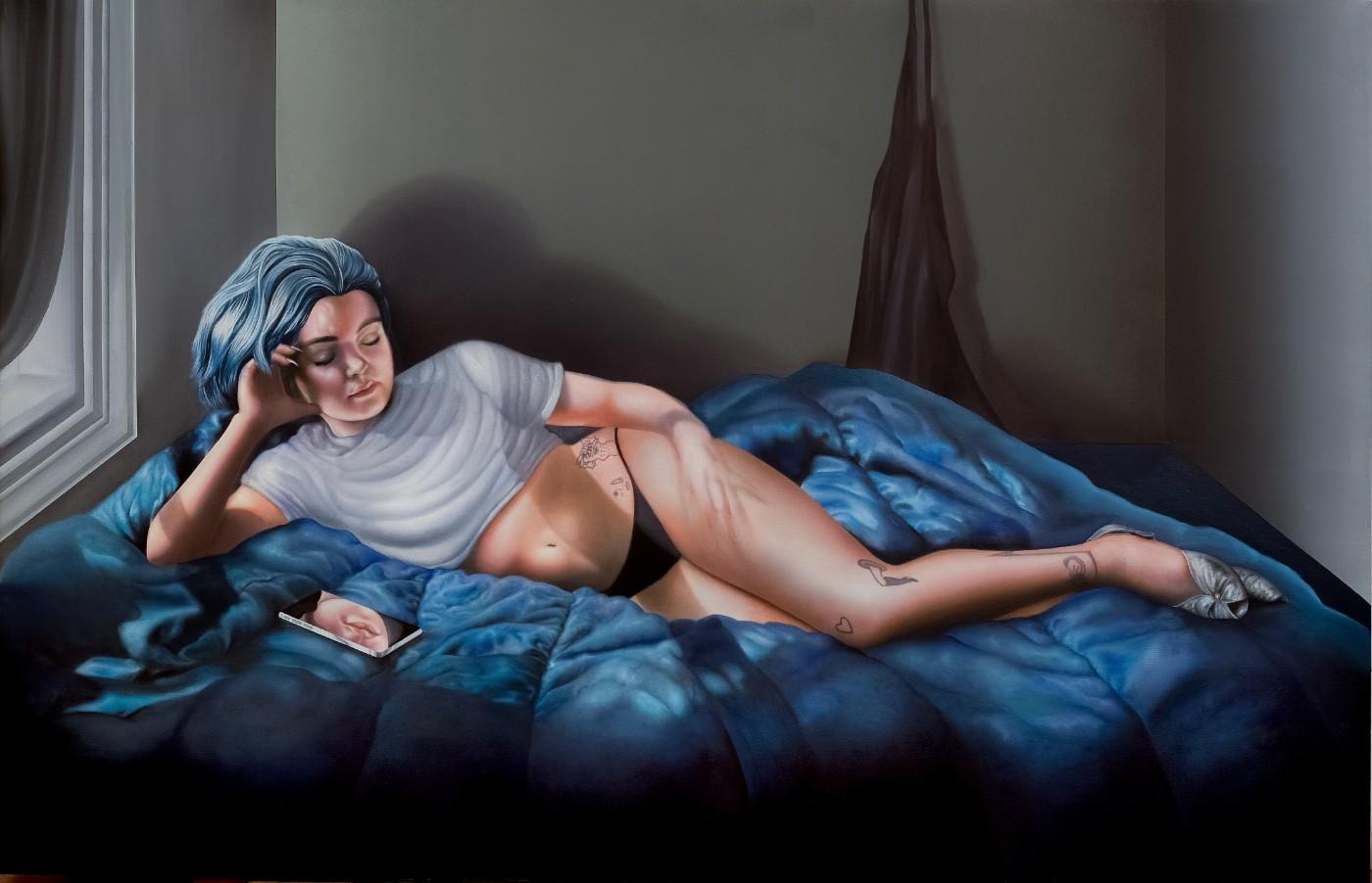 Sanctuary (Magdalena) (2019) depicts Farrell's friend, an East Village native. Since a very young age, she has been financially independent as rising rents pushed her immigrant family out of her childhood home. She is reclining on the bed in her actual room, which she affords on her own in a small apartment with roommates. Light peers through the window, extending a shadow over her reclining figure. She looks down, away from the viewer, but is vulnerable in her state of undress. She is wearing a crop-top tee shirt and panties, and a pair of vintage sandals. Her dyed blue hair is accented by cobalt blue bedding. A sign of her personal economic victory is the iPhone placed on her bed, reflecting her likeness. She is in a state between sleep and wakefulness. To Farrell, this invokes the terror of sleep paralysis that haunts her sitter just like it does the artist. It is a sign of stress in a world where income is perceived as proportional to security and abundance.