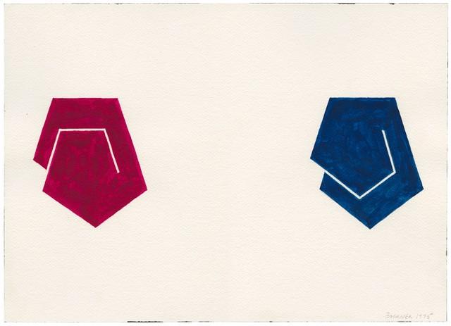 From the 1960s to today, Bochner has brought a strong interest in human perception and the interplay between visual and verbal language to his work. The BMA has a long history of acquiring and exhibiting Bochner’s work and this drawing is a gift of the artist in honor of former BMA Board Chair Suzanne Cohen, one of the artist’s most important patrons and a remarkable Baltimore philanthropist, who passed away in November 2018. A duple is defined as having two elements or as a multiple of two beats per measure of music. In Study for Duple, a pair of forms executed in red and blue reflects the artist’s interest in using geometry to explore the way that we perceive linear and spatial relationships when they are depicted on a two-dimensional surface. Lines fail to cohere into the pentagrams that we anticipate; however, these missed connections lead to the possibility of the forms being read as receding behind or emerging from the picture plane, depending on the viewer’s perceptual inclinations. This work joins 16 drawings, prints, books, and paintings by Bochner in the BMA’s collection. Cohen’s decades-long dedication to the artist and the BMA have ensured that the museum will be one of the most significant repositories of this influential conceptual painter’s works.
