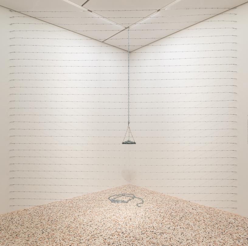 Edwards is a pioneering figure in contemporary abstract sculpture who has redirected the modernist tradition of assemblage in welded steel for more than five decades. Scales of Injustice reconstitutes Corner for Ana, one of four site-responsive works he created out of barbed wire and chains for his March 1970 Whitney Museum exhibition. Edwards originally intended to recreate the work for a 2017 exhibition in Venice, Italy, but instead adapted it to respond to the story of Pateh Sabally, a 22-year-old Gambian refugee who drowned off the coast of Venice in January 2017 while onlookers taunted him, filmed his struggles, and offered no help. Enclosed behind rows of barbed wire, the work includes a suspended steel platform, resembling one half of a weighted scale, and a length of chain placed beneath it on the floor. Scales of Injustice is recreated anew with each installation. It is the first work by Edwards to enter the BMA’s collection and builds on the BMA’s strong holdings of post-war sculpture and conceptual art by Donald Judd, Sol LeWitt, Bruce Nauman, and John T. Scott. The BMA is organizing an exhibition to open in 2019 dedicated to Edwards’s profound long-term engagement with the work of African blacksmiths, sculptors, and artisans.