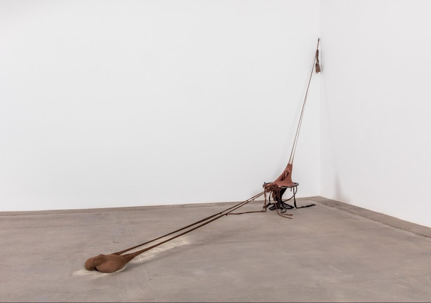Nengudi emerged in the 1970s as one of the most inventive artists bringing together abstract sculpture and performance art. She began her acclaimed and ongoing R.S.V.P. (Répondez s’il vous plaît) series following the birth of her first child in 1974 and returned to this body of work in 2003 with the R.S.V.P. Reverie series. This acquisition exemplifies the series through its dynamic balance of energetic forces that include a readymade metal armature adorned with braided nylons and lengths of pantyhose held in place on the wall by powerful magnets or jettisoned across the floor, culminating in a plump, sand-filled pouch. Though Nengudi’s sculptures cannot be touched by viewers in a museum setting, the invitation stands as a call to approach the works in a present and active frame of mind. R.S.V.P. Reverie-0 is the first work by Nengudi to enter the BMA’s collection. It furthers the museum’s commitment to expanding its holdings of postwar work by women and artists of color and builds on the BMA’s strong collection of contemporary sculpture, especially sculptural work concerned with sensory experience, ephemerality, performance, and the body.