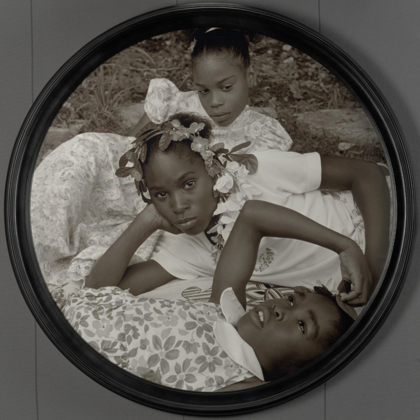 Weems is one of the foremost photographers of her generation, addressing topics of race and gender with images that are staged or appropriated from historical photographs. The BMA has acquired her artist proof of this stunning image from the haunting May Days Long Forgotten series. The sepia-toned and circularly shaped picture evokes the work of 19th-century Pictorialists, including Julia Margaret Cameron (1815–1879), who made photographs informed by the aesthetic, allegorical, and narrative impulses associated with painting. Weems’s subjects are girls from working-class families in Syracuse, New York, whose race and class would have excluded them as Pictorialist subjects, despite the way they so beautifully personify spring, youth, and renewal. The convex glass with which the work is framed further points to earlier regimes of optics and seeing, periods in which curved glass lenses were important technologies for both perceiving and distorting the realities of our world. May Flowers joins two major multi-photograph works by Weems from the 1990s in the BMA’s collection.