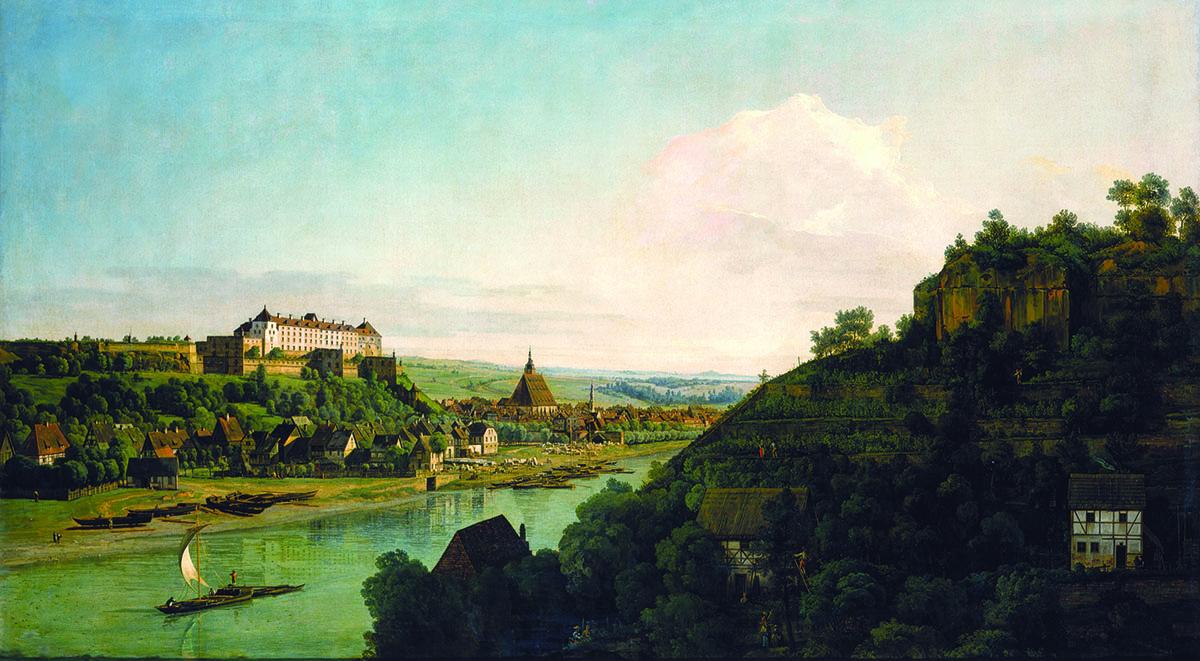 In the 1740s, Frederic Augustus was engaged in a massive building campaign aimed at making his Saxon capital, Dresden, one of the most vibrant architectural and artistic centers in Europe, and he called the Venetian painter Bernardo Bellotto to court to document his accomplishments on a grand scale. Fulfilling this prestigious commission, Bellotto produced a series of majestic depictions of Dresden’s major buildings, grouped on the banks of the Elbe River, and of the nearby town of Pirna, with its stately fortress, Sonnenstein, perched on a cliff above the town.